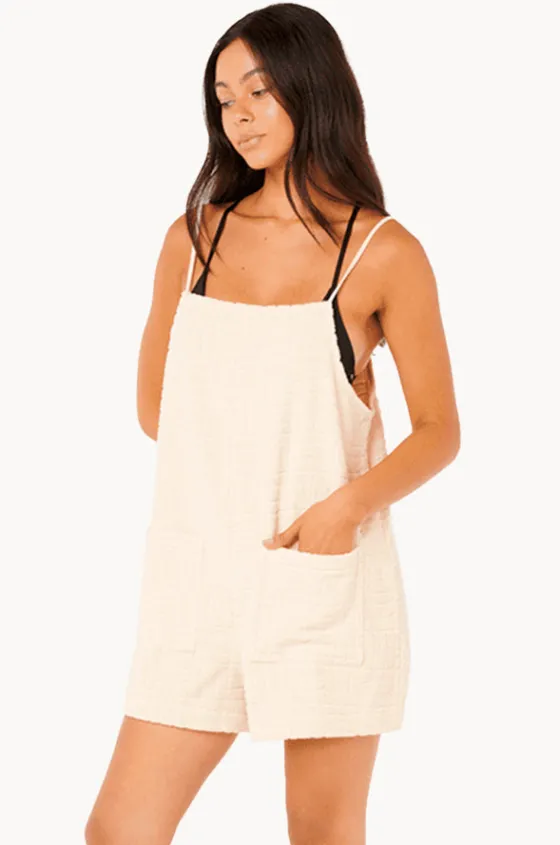 Rip Curl Aloha State Terry Romper in Off White features adjustable straps, two front pockets, relaxed fit, and is available in sizes XS-L.