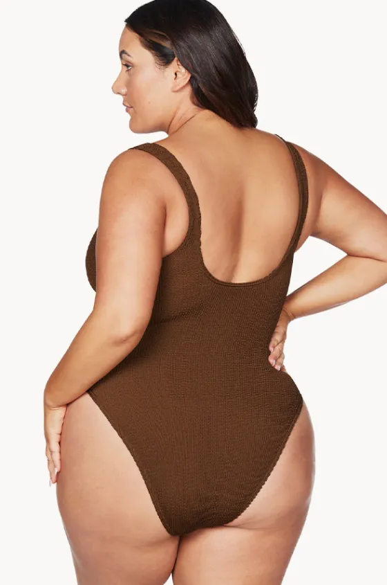 The Artesands Arte Kahlo One Piece in Mocha, features a minimalist design with a scoop neckline, supportive fit, and designed for sizes 12-22.