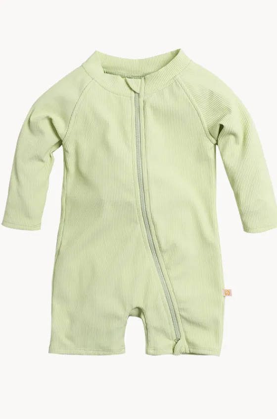 Tini Togs Baby Boys Zip Boyleg Sunsuit in Apple offers long sleeves, sun protection rating, full length zipper, boyleg coverage, and is available in sizes 0-3.
