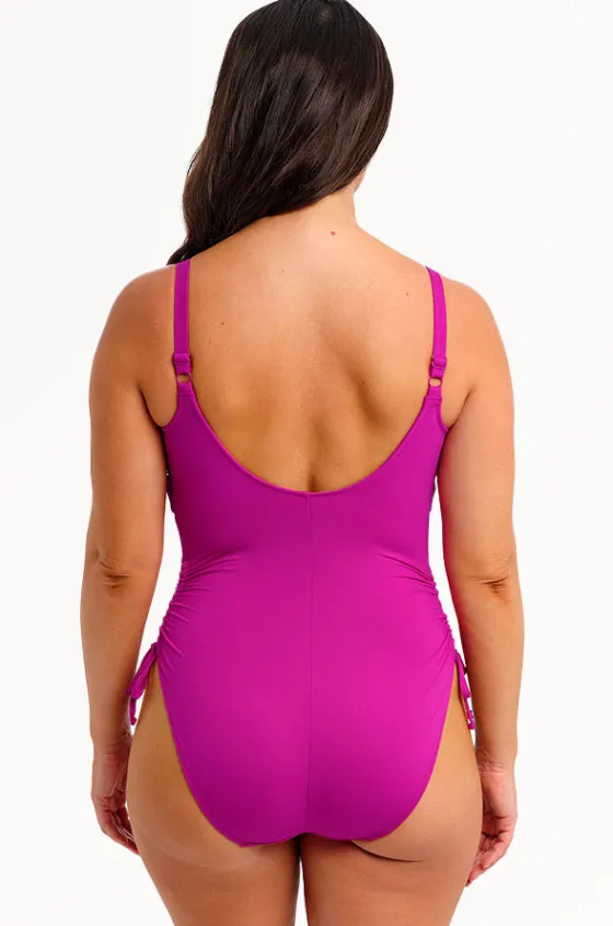 Fantasie Beach Waves F Cup Twist Front One Piece in Fuchsia features a twist front design, underwire, adjustable straps, and is best suited to a F cup size.