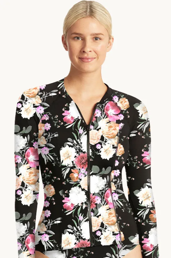 The Sea Level Belle Long Sleeve Suntop in Black features a soft neckband, long sleeves, contour side panels, UPF 50+ sun protection, designed for A-DD cups.