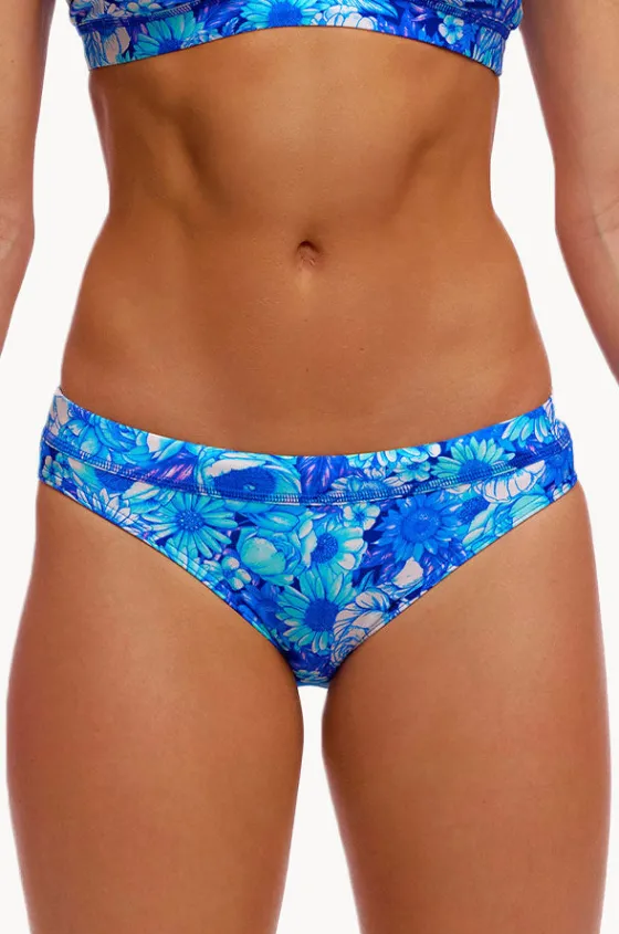 Funkita Bloom Shakalaka Sports Brief in Blue offers an elastic waist, internal drawcord, medium coverage, chlorine resistant, available in sizes 8-14.