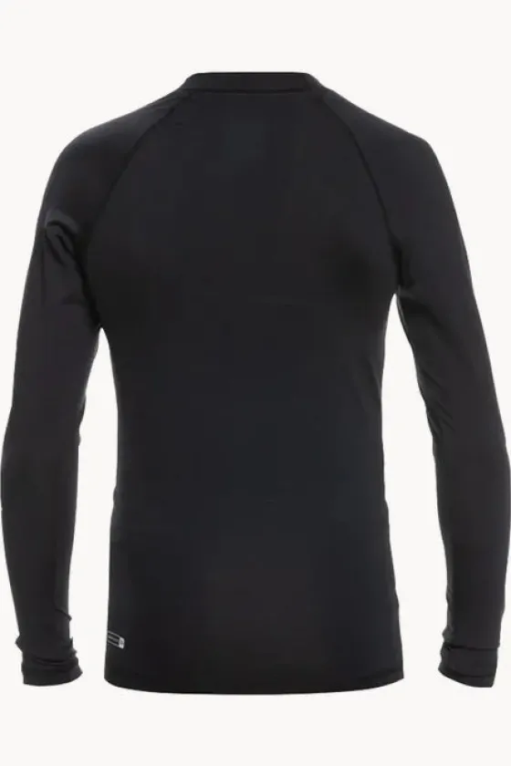 Quiksilver Boys All Time Long Sleeve Suntop in Black features a high neckline, long sleeves, sun protection rating, snug fit, and is available in sizes 10-16.