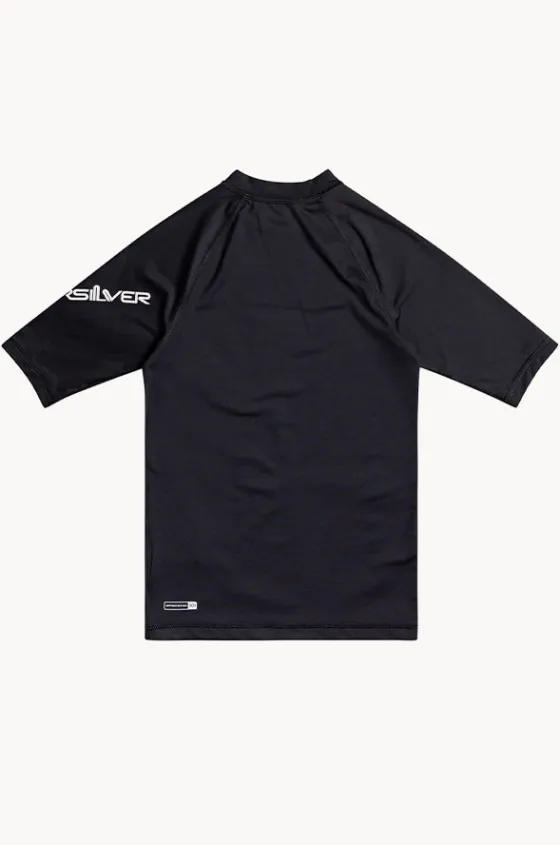 Quiksilver Boys All Time Short Sleeve Rashie in Black features a round neckline, snug fit, short sleeves, sustainable, and has a UPF 50+ sun protection rating.