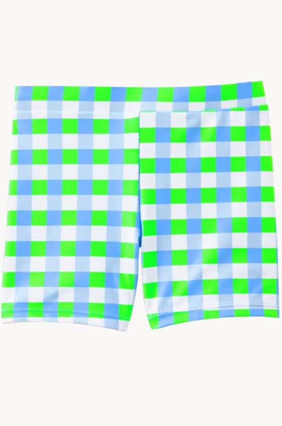 Milky Boys Check Swim Short in Green/Blue features a trunk style, elasticated waistband, pull-on design, and is available in sizes 3-7.