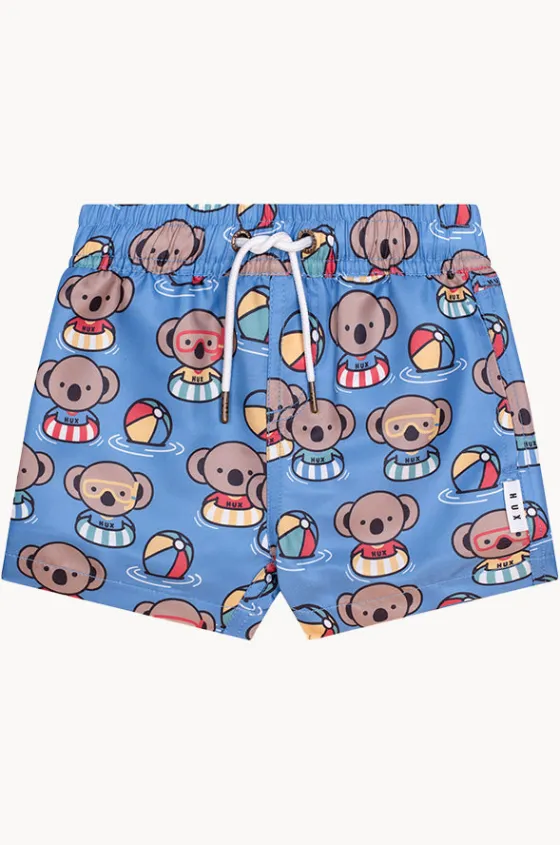 Huxbaby Boys Kel Koala Swim Short in Marine features an elasticated waistband, drawcord, sun protection rating, sustainable, and is available in sizes 3-6.