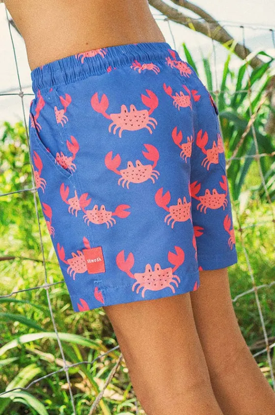 Skwosh Boys Mr Pinchy Eco Short in Navy offers an elasticated waistband, drawcord, mesh inner brief, sustainable fabric, and is available in sizes 2-6.