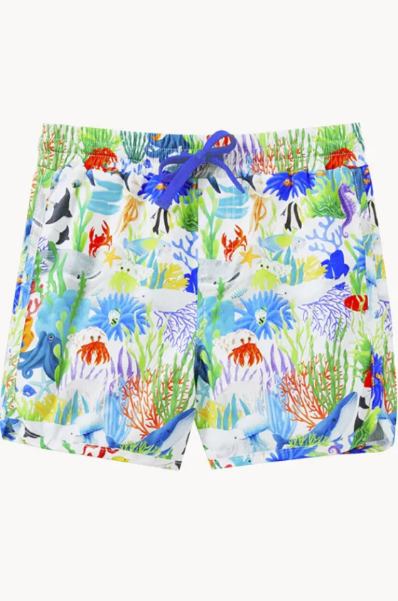 Milky Boys Underwater Boardshort in Multi features an elasticated waistband, drawcord, mock fly stitching, regular fit, and is available in sizes 2-7.