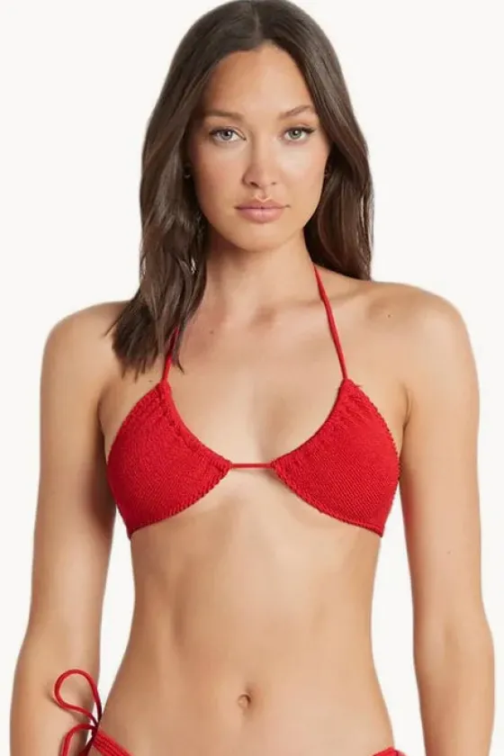 The Bond-Eye Eco Sofie Tri in Red features a triangle bikini shape, adjustable straps and textural, stretch fabrication, and is designed for A-C cup sizes.