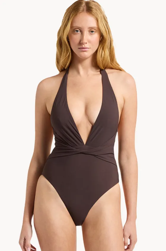 Jets Jetset Plunge One Piece in Chocolate features a plunge neckline, adjustable halter tie, twist front detail, low back, and is best suited to A-C cup sizes.