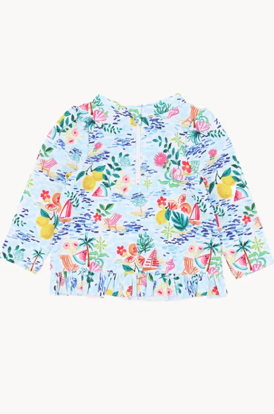 Minihaha Girls Addison Suntop in Blue/Multi features a round neckline, long sleeves, back zip, sun protection, sustainable, and is available in sizes 1-2.