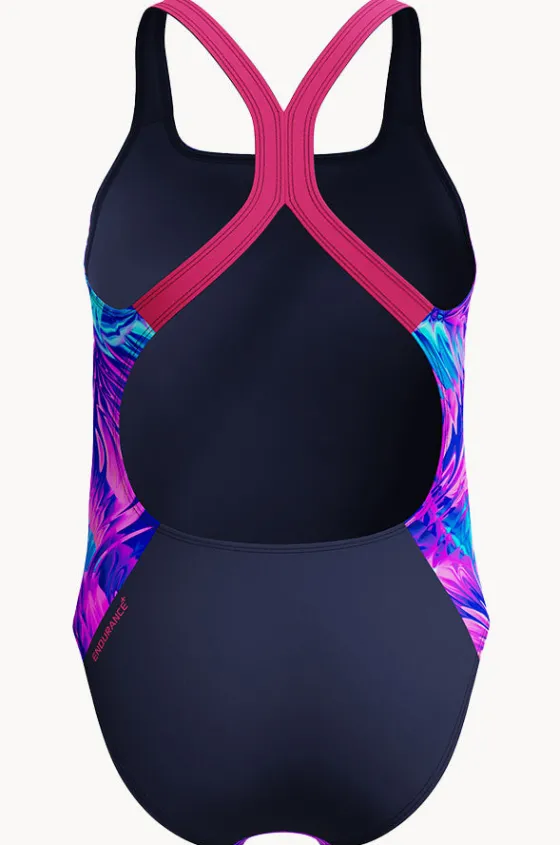 Speedo Girls Allover Print Powerback One Piece in Pink/Blue offers a chlorine resistant thread, powerback straps, sustaniable, and is available in sizes 8-14.