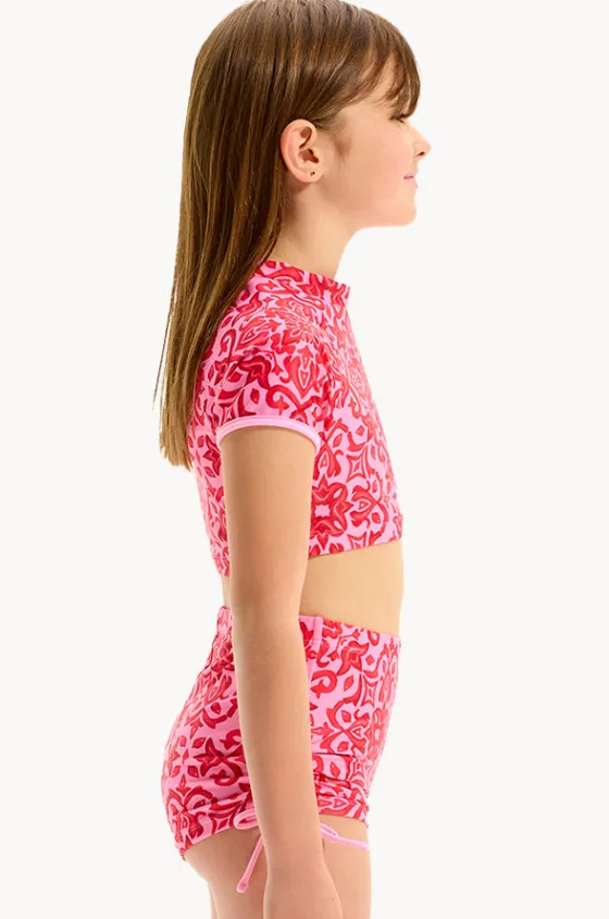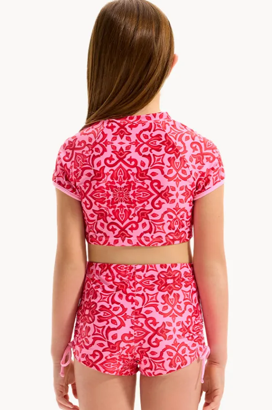 Seafolly Girls Capri Tile Suntop Set in Red/Pink features a crop top, cap sleeves, contrast binding, boyleg pant with tie sides, and is available in sizes 8-16.