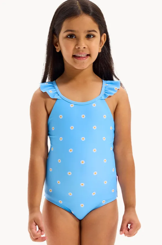 Seafolly Girls Daisy Chain One Piece in Blue features a round neckline, cross back straps with frills, fully lined, and is available in sizes 5-7.
