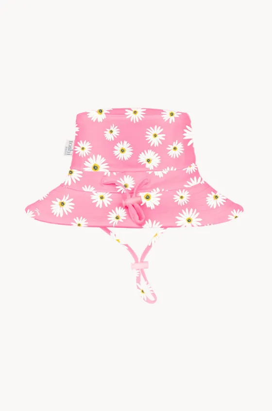 Toshi Girls Daisy Paradise Swim Sunhat in Watermelon features a bucket style hat, chin strap with toggle, sun protection rating, and is available in sizes S-L.