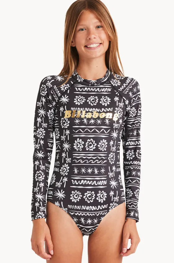 Billabong Girls Lost On You Long Sleeve Sunsuit in Black offers long sleeves, sun protection rating, back zipper, sustainable, and is available in sizes 10-14.