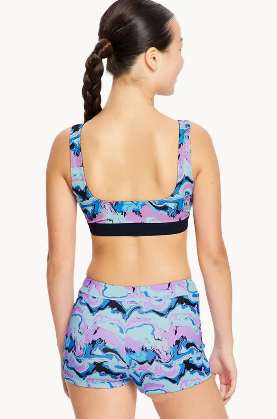 Modibodi Girls Marble Reversible Crop Set in Blue/Navy features a reversible crop top, mid rise boyleg pant, super absorbency, and is available in sizes 10-16.