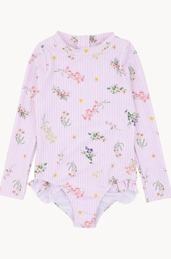 Minihaha Girls Myra Sunsuit in Pink/Multi features a round neckline, back zipper, frill detailing, sun protection, long sleeves, and is available in sizes 3-6.