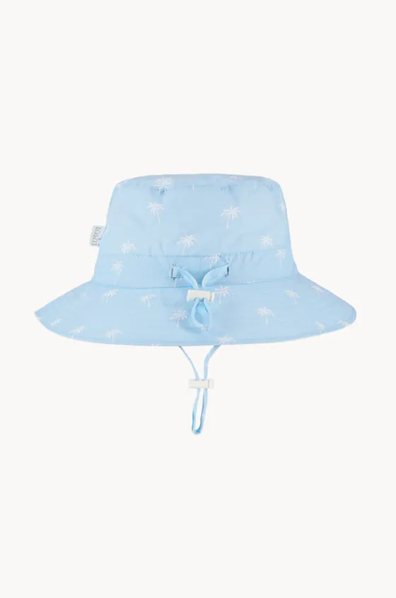 Toshi Girls Palm Spell Sunhat in Sky features a bucket style hat, brim, sun protection rating, chin strap with toggle, and is available in sizes S-XL.