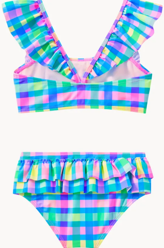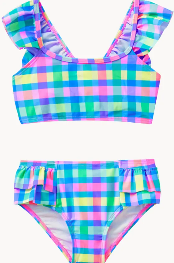 Milky Girls Picnic Check Crop Set in Multi offer a crop style top, frill detail on straps and pant, matching hipster pant, and is available in sizes 2-7.
