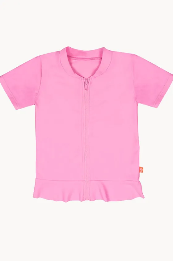Salty Ink Girls Short Sleeve Zip Suntop in Candy features a round neckline, front zipper, short sleeves, sun protection rating, and is available in sizes 3-7.