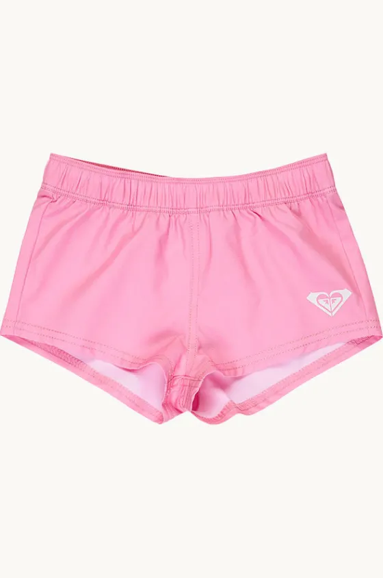 Roxy Girls Solid Basic Boardshort in Bon Bon features an elasticated waistband, short length, sustainable thread, and is available in sizes 5-7.