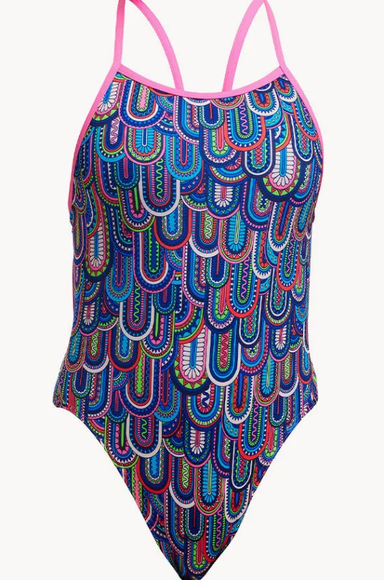 The Funkita Girls Spread My Wings Single Strap One Piece in Multi offers single bind straps, quick dry and chlorine resistant fabric, available in sizes 8-14.