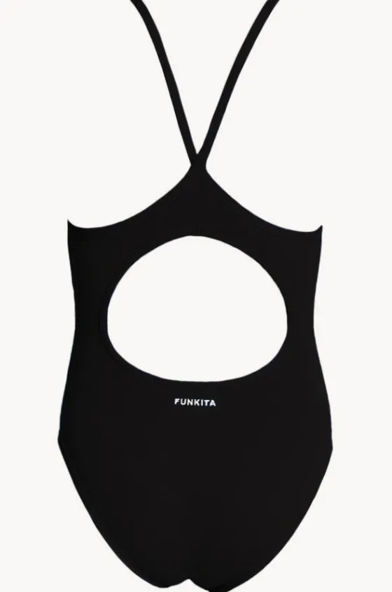 The Funkita Girls Still Black Diamond Back One Piece in Black offers single bind straps, quick drying and chlorine resistant, available in sizes 8-14.
