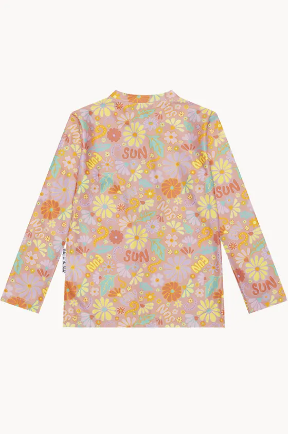 Babes In The Shade Girls Sunny Girl Suntop in Orange/Pink offers UPF 50+ sun protection, long sleeves, chlorine resistant, and is available in sizes 5-7.