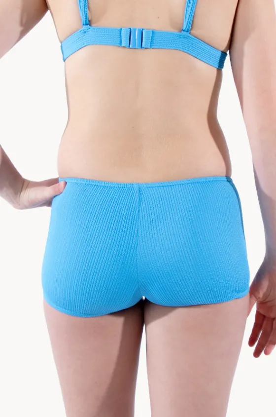 Base Swim Girls Textured Boyleg in Azure features a low-mid rise waist, low legline, boyleg coverage, fully lined, and is available in sizes 8-16.