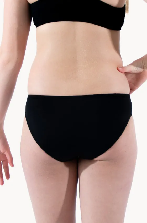 Base Swim Girls Textured Regular Pant in Black features a hipster style, regular legline, medium coverage, fully lined, and is available in sizes 8-16.
