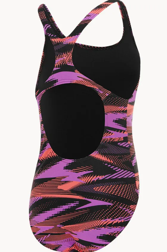 Speedo Hyperboom Allover Medalist One Piece in Violet highlights a medalist strap design, chlorine resistant fabric and is best suited to A-C cup sizes.