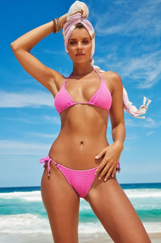 The Baku Ibiza Slide Tri in Flamingo features adjustable straps, a sliding clasp back, and a flattering design, available in sizes 6-14.