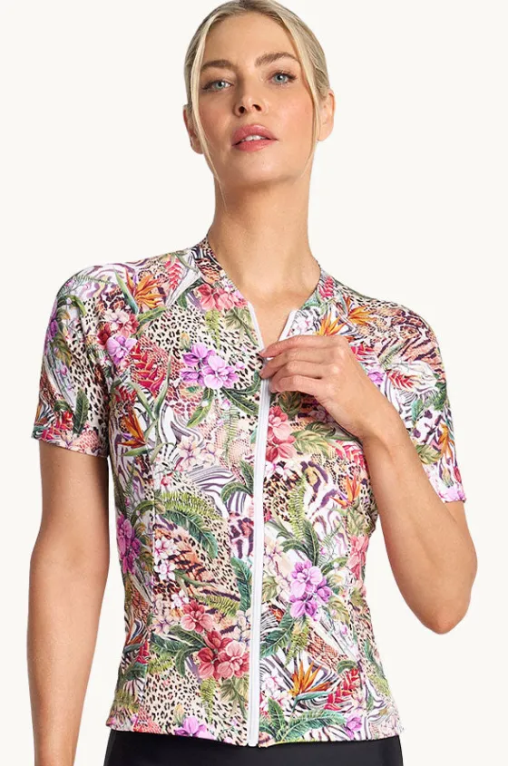 Jantzen Lilymaze Short Sleeve Suntop in Skin features front zipper, short sleeves, mastectomy pockets, soft cups, and is best suited to A-C cup sizes.