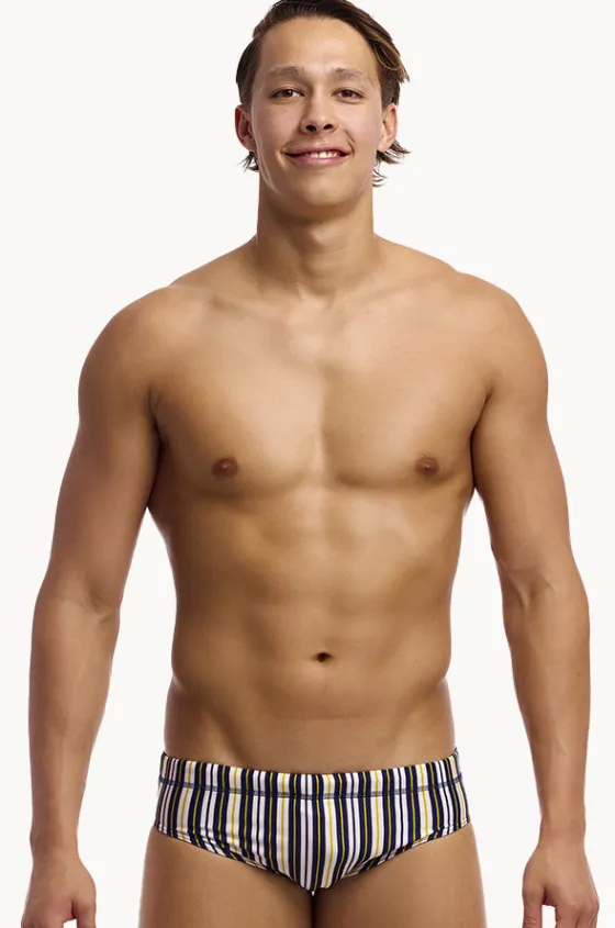 Funky Trunks Mens Admiralty Stripe Brief in Navy/Yellow offers 8cm sides, chlorine resistant thread, internal drawcord, lined, and is available in sizes 32-38.