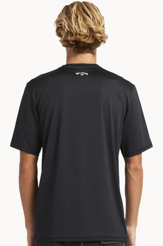 Billabong Mens All Day Wave Short Sleeve Suntop in Black features a round neckline, short sleeves, T-Shirt fit, sustainable, and is available in sizes S-2XL.