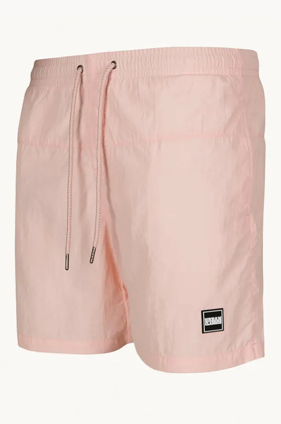 Urban Classics Mens Block Swim Short in Pink features a 5″ inseam, quick-dry nylon, mesh lining, drawstring waist & side pockets.