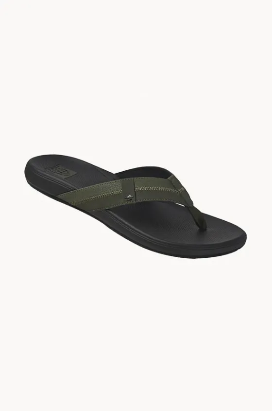 Reef Mens Cushion Phantom 2.0 Thong in Olive offers a comfortable synthetic strap, arch support, moulded rubber outsole, available in sizes 8-13.