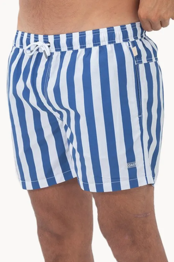 Coast Mens Santorini Swim Short in Blue features an elasticated waistband, drawcord, inner mesh brief, side pockets, back pocket, is available in sizes S-3XL.