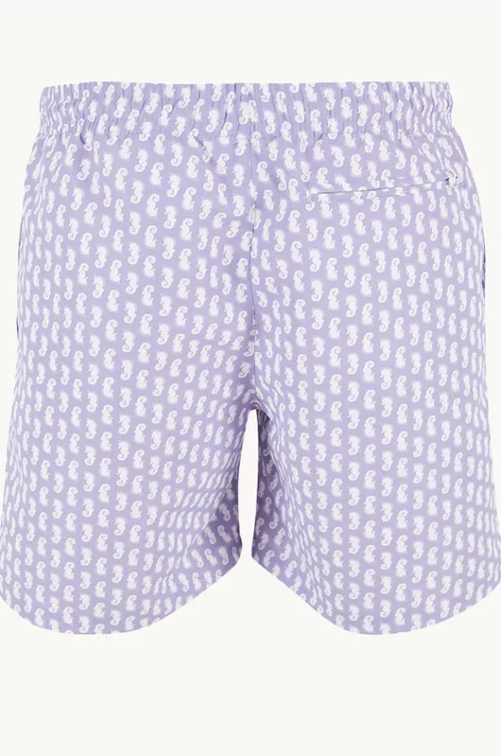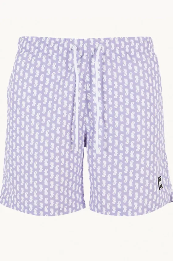 Urban Classics Mens Seahorse Swim Short in Lilac features a 5″ inseam, quick-dry nylon, mesh lining, drawstring waist & side pockets.