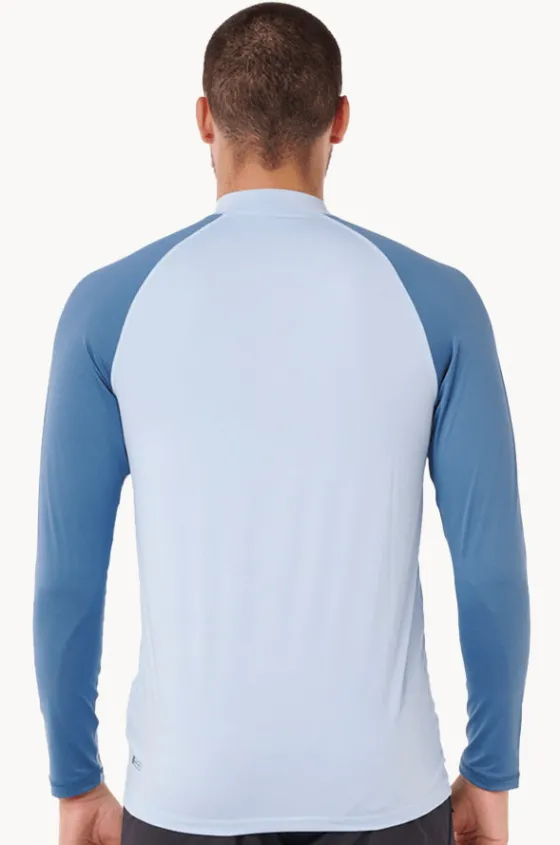 Rip Curl Mens Shock Long Sleeve Suntop in Blue features long sleeves, UPF 50+ sun protection, branding detail on front, and is available in sizes S-XL.