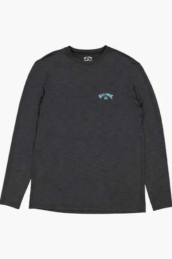 Billabong Mens Shoreline Long Sleeve Suntop in Black features a round neckline, long sleeves, UPF 50+ sun protection rating, and has a loose fit.