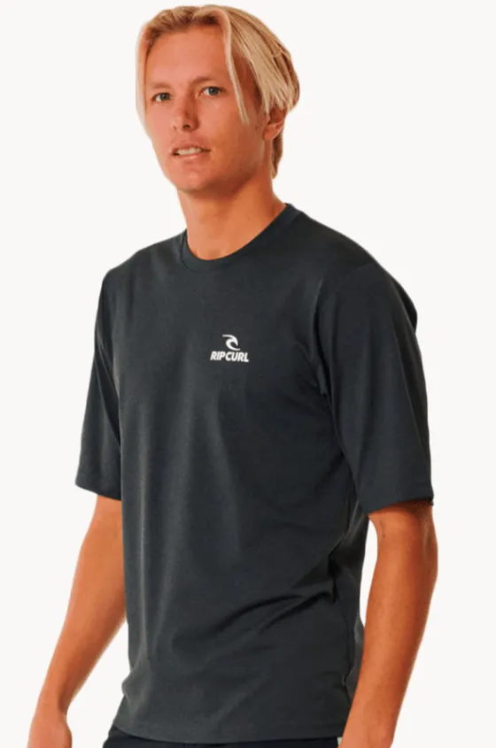 Rip Curl Mens Stack Short Sleeve Suntop in Black features a round neckline, short sleeves, UPF 50+ sun protection rating, and is available in sizes XS-3XL.