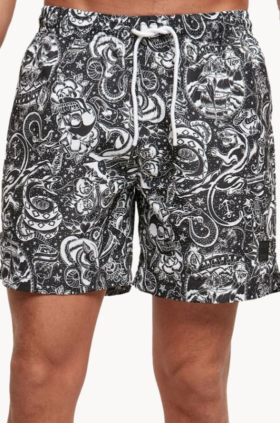 Urban Classics Mens Tattoo Swim Short in Black/White features a 5″ inseam, quick-dry nylon, mesh lining, drawstring waist & side pockets.