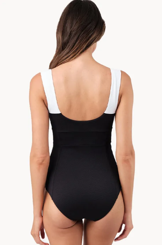 Une Piece Monochrome Texture Classic Square Neck One Piece in Black/White offers removable bows on straps, fixed straps, and is best suited to B-D cup sizes.