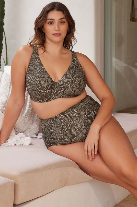 Artesands Onda Perspective Goya G Cup Bra in Olive features a modest neckline, underwire, adjustable straps, powermesh, and is best suited to a G cup size.