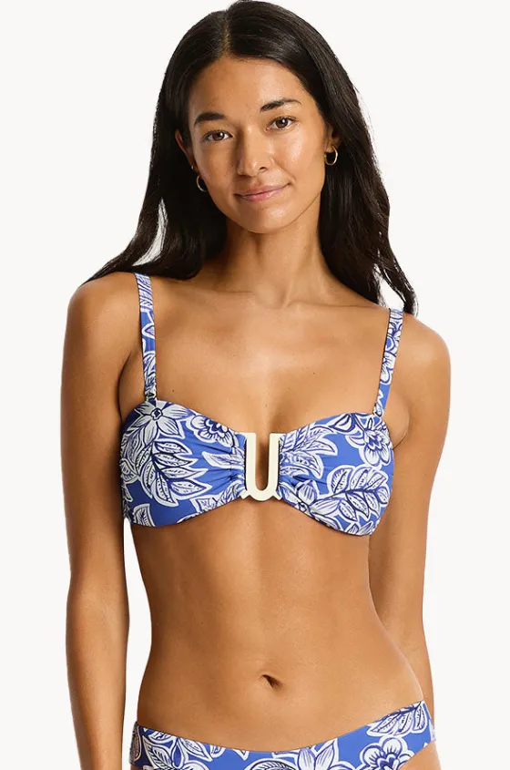 Sea Level Palmera U Bar Bandeau in Blue features a front U-bar detail, removable cups, side boning, optional straps, powermesh, and is designed for B-D cups.