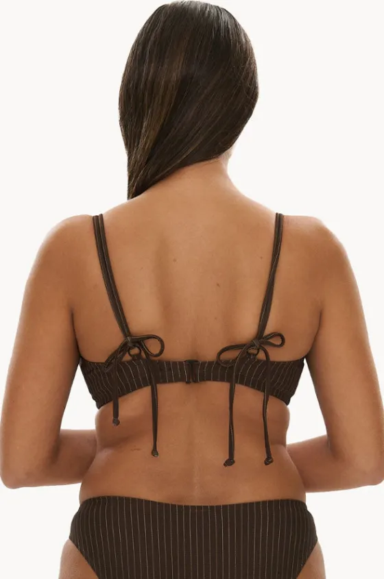 RAQ Pinstripe E/F Cup Underwire Halter in Chocolate offers adjustable and convertible straps, underwire, powermesh lining, and is best suited to E-F cup sizes.