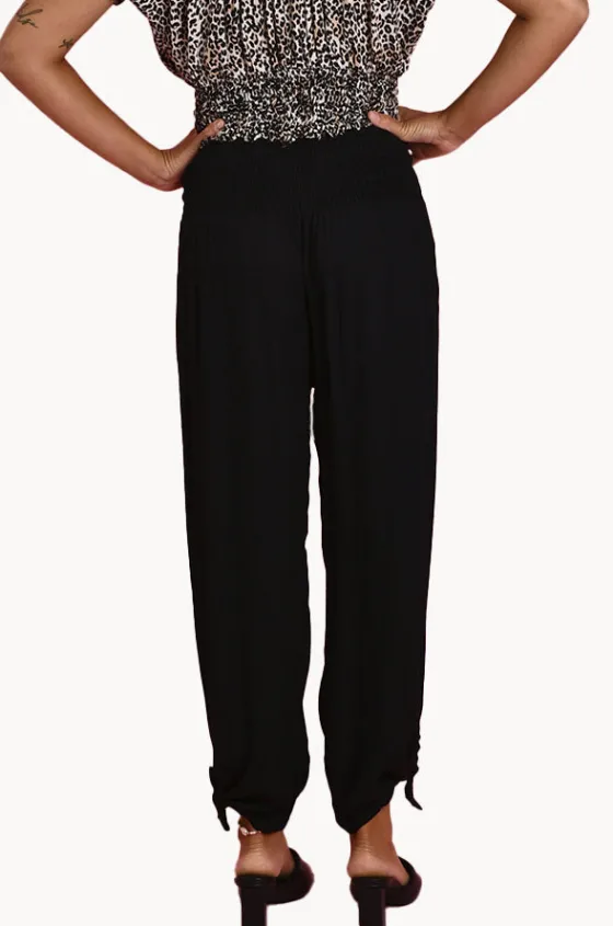 Go Girl Plain Long Rouched Tie Pants in Black features an elastic shirred waistband, long length, tie ends, full length, and is available in sizes S-XL.