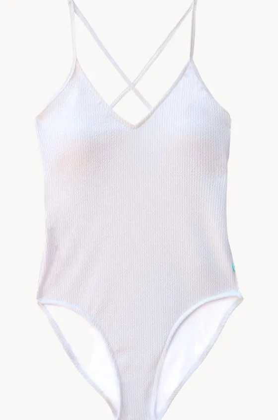 Salty Ink Salty Rib One Piece in White features a V-shaped neckline, adjustable tie back, medium coverage, ribbed fabric, and is best suited to A-C cup sizes.